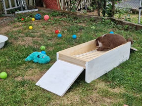 Der Garten bietet mit seinen verschiedenen Spielmöglichkeiten genug Abwechslung für die Kleinen. Durch die Wackelbrücke, das Hängebrett oder das Balanceboard, können sich die Welpen motorisch weiterentwickeln und ein Gefühl für ihren eigenen Körper und die Balance entwickeln. Zu dem bekommen sie noch andere Spielsachen und bei warmen Temperaturen eine Muschel mit Wasser angeboten.